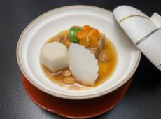 会席の蓋物として鹿児島黒豚を使用し、桜島大根を添えています。